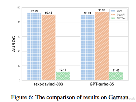 非英语检测是另一个亮点。作者在 WMT16 的德语部分上,让 GPT 在英文源句上生成德语译文,比较不同检测器的表现。结果表明,GPTZero 在德语上几乎只是随机猜测,OpenAI classifier 还能勉强工作,而 DNA-GPT 的黑盒和白盒版本则都取得了 90% 左右的 AUROC,在某些设置中甚至超过 OpenAI classifier。