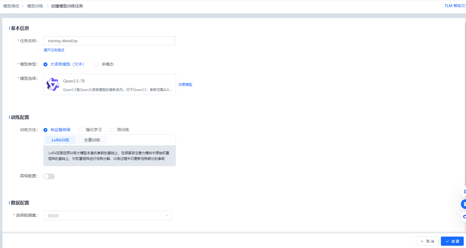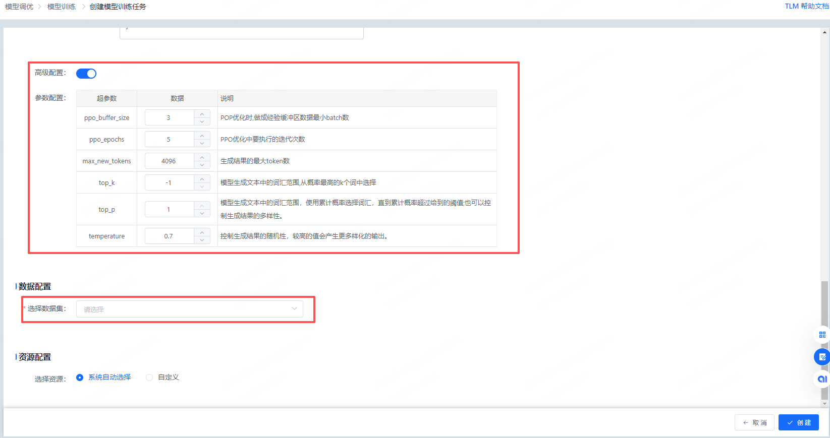 然后乐意设置高级参数,并选择训练的数据集。平台提供自定义的资源选择方式,方便用户选择合适规格的算力资源,同时也可以使用系统自动选择资源的方式(提升用户体验)。点击“创建”按钮,可提交训练任务。