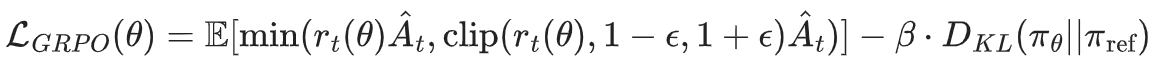 GRPO采用KL散度约束替代PPO的裁剪机制,通过: