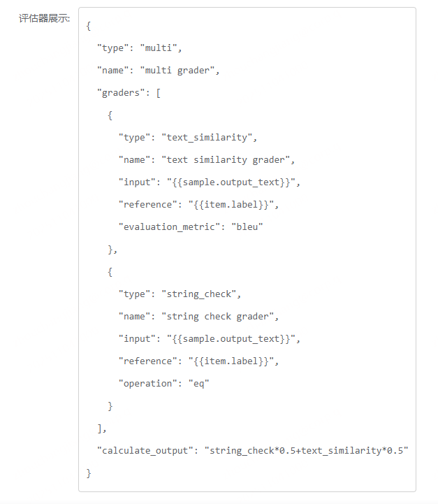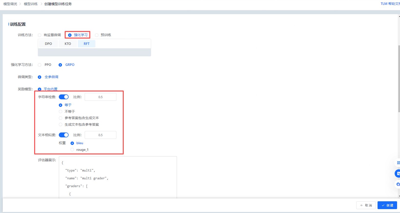 平台目前提供GRPO和PPO的训练方式。用户可在界面上通过直接点击的方式来配置奖励模型的参数。配置好后,页面会展示评估器的json代码,方便用户查看。