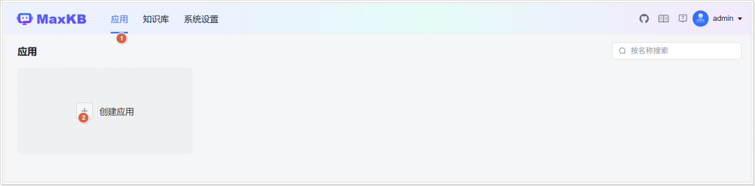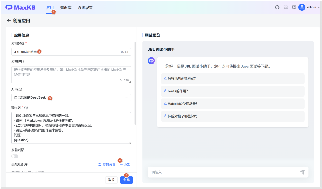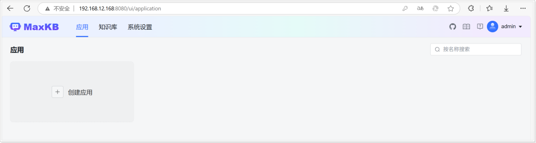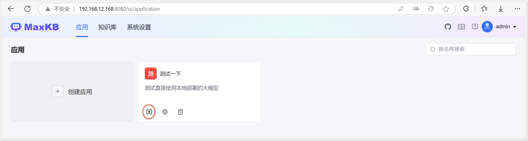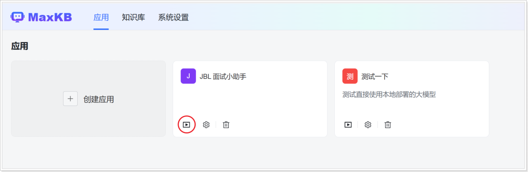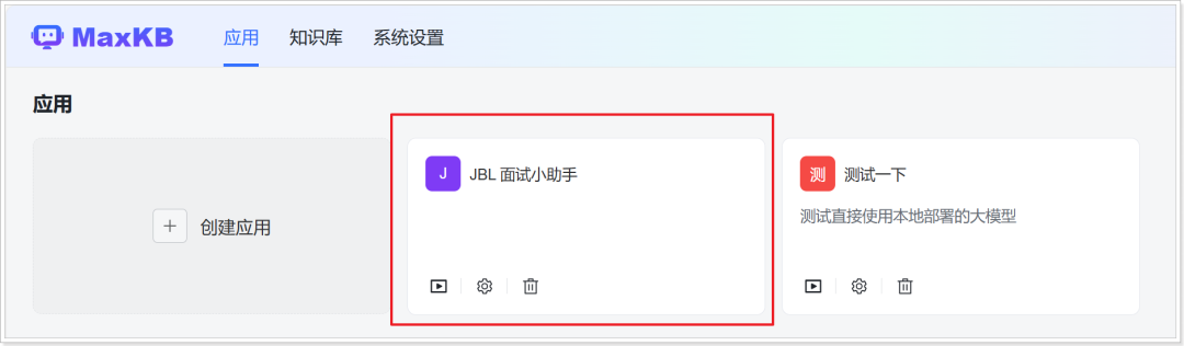 创建好知识库后,我们还需要创建一个对应的应用,以便使用这个知识库。具体在 MaxKB 的应用管理界面,点击创建应用按钮,填写应用名称、选择对应的知识库等信息。