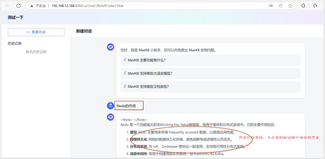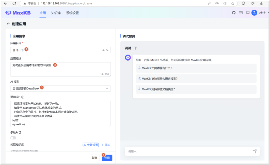 我们先使用MaxKB测试一下,没有投喂资料之前的使用情况。