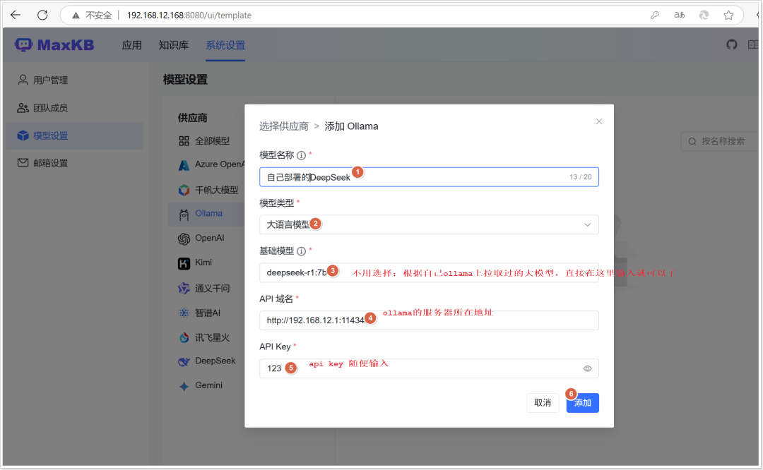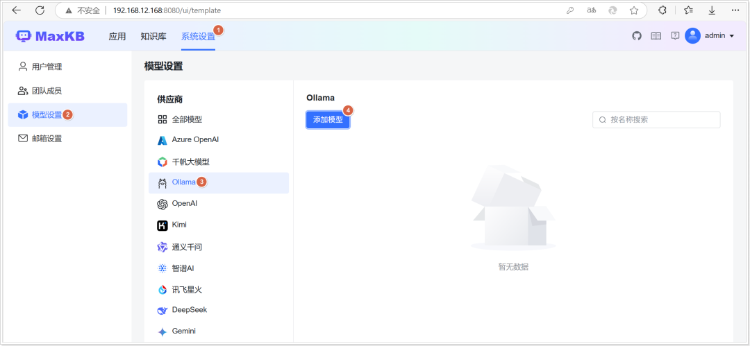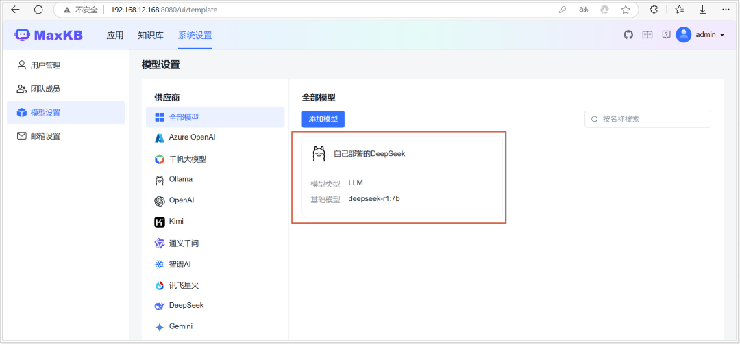 我们希望MaxKB对接的是我们自己部署的私有大模型;而我们自己的QWQ 或者 DeepSeek 等大模型都是部署在Ollama上的;所以需要在MaxKB上集成Ollama然后能够访问、连接我们自己部署的大模型。。具体步骤如下: