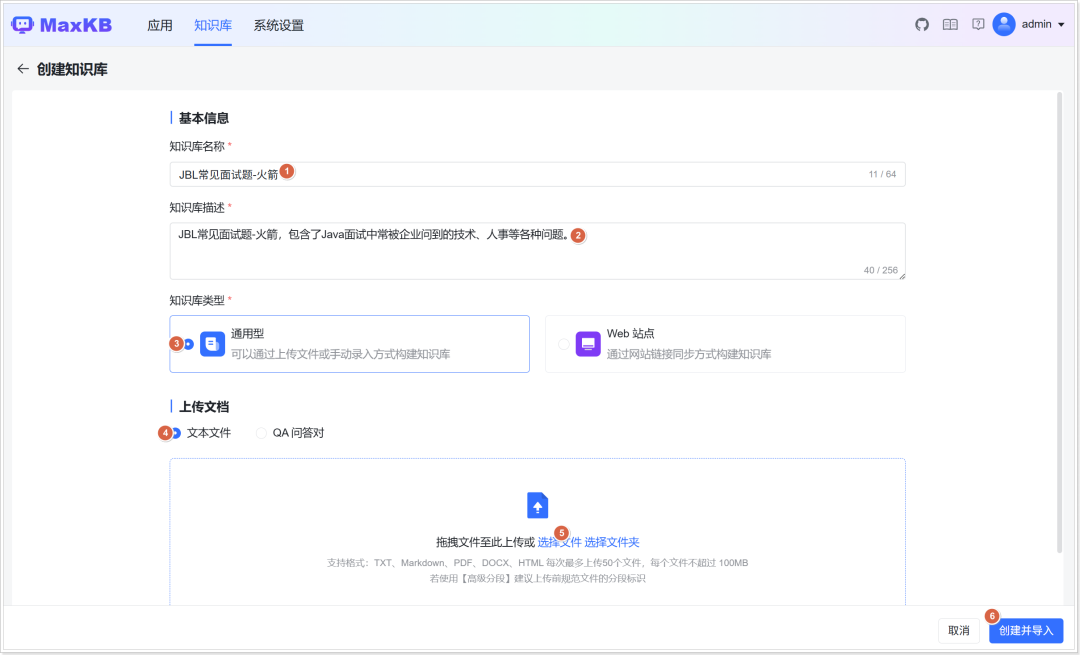 - 新建知识库:在 MaxKB 界面中,找到新建知识库的按钮,点击后按照提示输入知识库的名称、描述等信息。