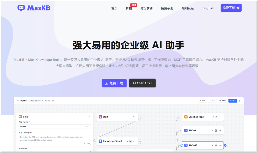 MaxKB = Max Knowledge Brain,是一款强大易用的企业级 AI 助手,支持 RAG 检索增强生成、工作流编排、MCP 工具调用能力。MaxKB 支持对接各种主流大语言模型,广泛应用于智能客服、企业内部知识库问答、员工业务助手、学术研究与教育等场景。