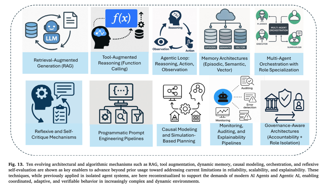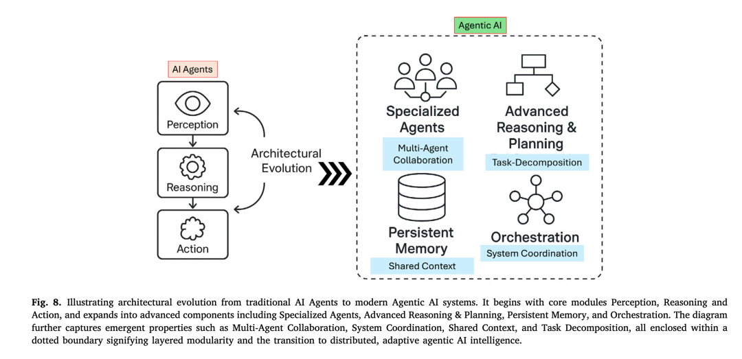 图5: 从 AI Agent 到 Agentic AI 的架构演进示意图,展示了从核心模块到协作能力的扩展。