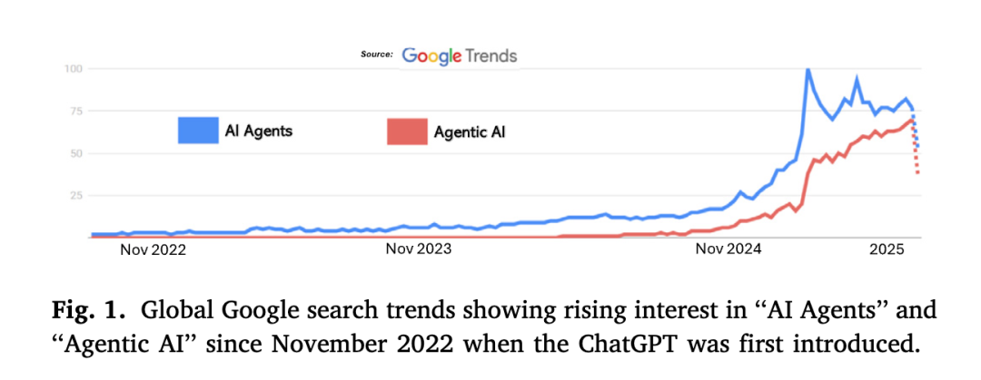 随着 2022 年底生成式模型(尤其是 LLM)的出现,AI 领域发生了显著变化。谷歌趋势数据显示,全球对“AI Agents”和“Agentic AI”的搜索兴趣大幅增加。这反映了代理设计理念的转变:从静态、规则驱动的自动化,演变为由学习驱动、能够与非结构化动态输入交互的灵活架构。