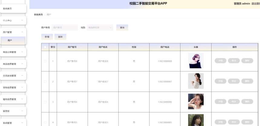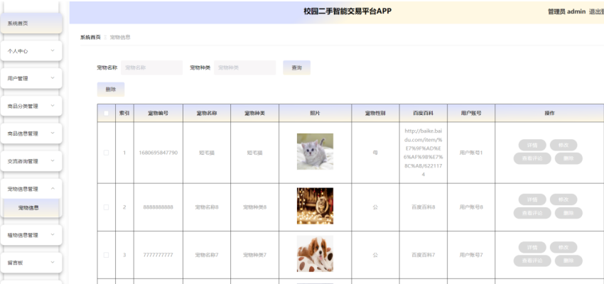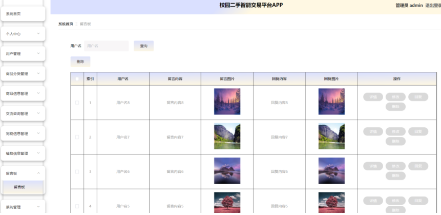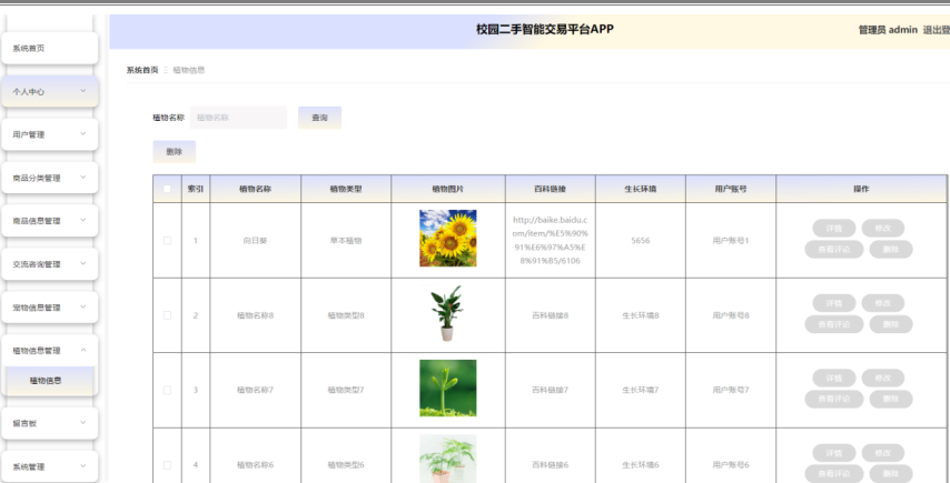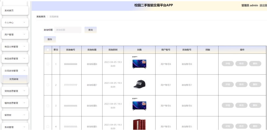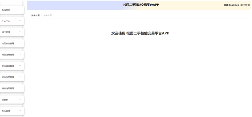 管理员登录进入校园二手智能交易平台APP可以查看系统首页、个人中心、用户管理、商品分类管理、商品信息管理、交流咨询管理、宠物信息管理、植物信息管理、留言板、系统管理等信息,进行相应操作,如图5-9所示。