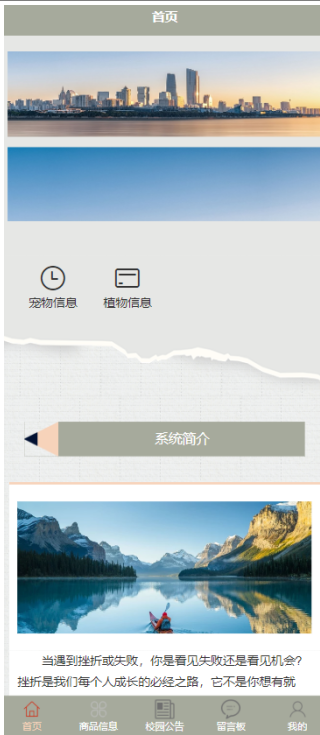 APP首页是用户注册登录后进入的第一个界面,用户可通过APP端首页的最下面的那一行导航栏中的“首页、商品信息、校园公告、留言板、我的”进入到相应的网页进行操作;点击“我的”进入我的页面,在我的页面可以对商品信息、交流咨询、宠物信息、植物信息、我的收藏管理、在线反馈、留言板等进行详细操作。APP首页界面如图5-3所示。