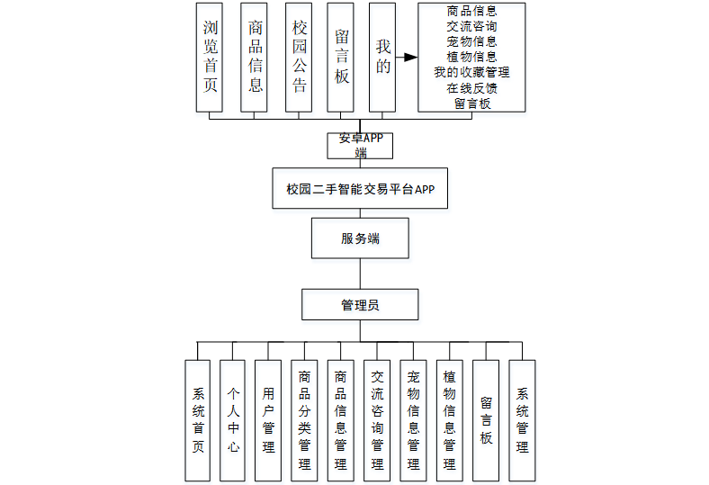 系统功能结构图是系统设计阶段,系统功能结构图只是这个阶段一个基础,整个系统的架构决定了系统的整体模式,是系统的根据。校园二手智能交易平台APP的整个设计结构如图4-1所示。