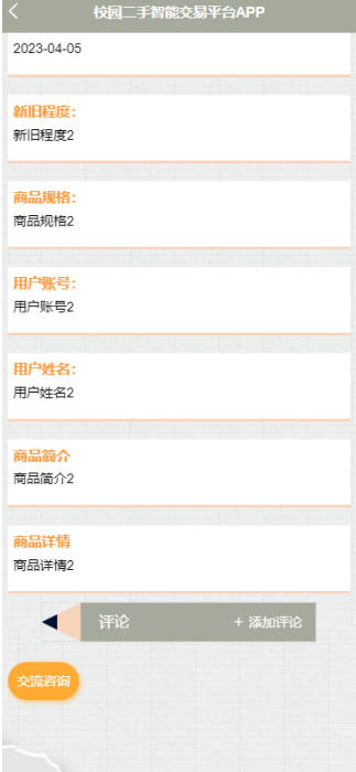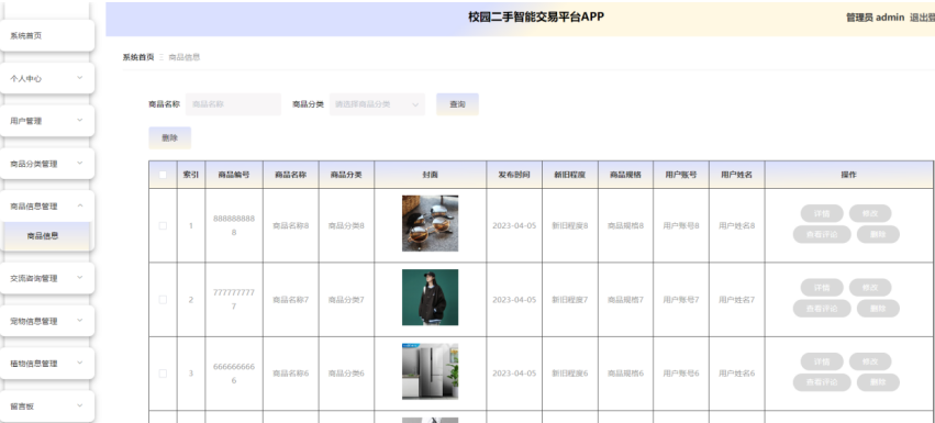 用户点击商品信息,在商品信息页面的搜索栏输入商品编号、商品名称,进行搜索,然后可以查看商品编号、商品名称、商品分类、封面、发布时间、新旧程度、商品规格、用户账号、用户姓名等信息,还可以点击交流咨询等操作,如图5-4所示。