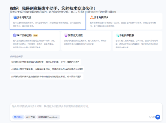 - 可对方案追问细化,通过技术问题交流,自动可拆解问题、理解技术瓶颈,并给出多条技术路径和设计方案以及参考专利,均可查看核心方案和相关思路,还可以不断追问,从而激发灵感,获得创新的技术路径。
