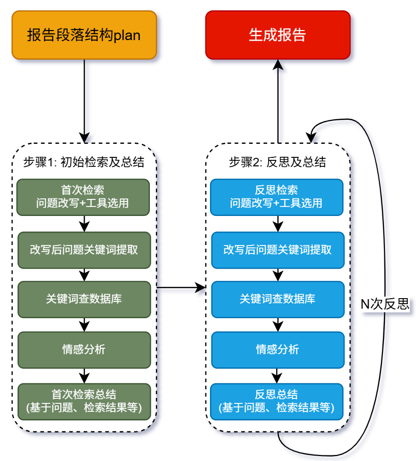 (3) 多次反思迭代完成后,基于多个段落的内容(title, content, summary等),生成最终的舆情报告。