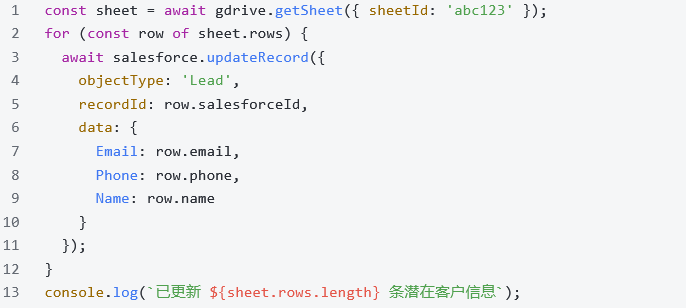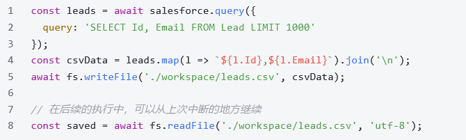 想象一个场景,你需要将一份包含客户联系方式的电子表格导入到销售力量中。智能体编写的代码是这样的: