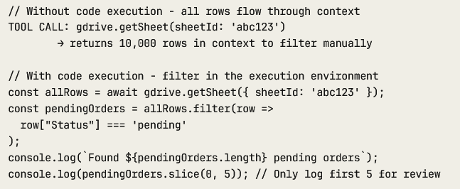 想象一下获取一个包含1万行数据的电子表格。在没有代码执行的模式下,所有数据都将涌入上下文: