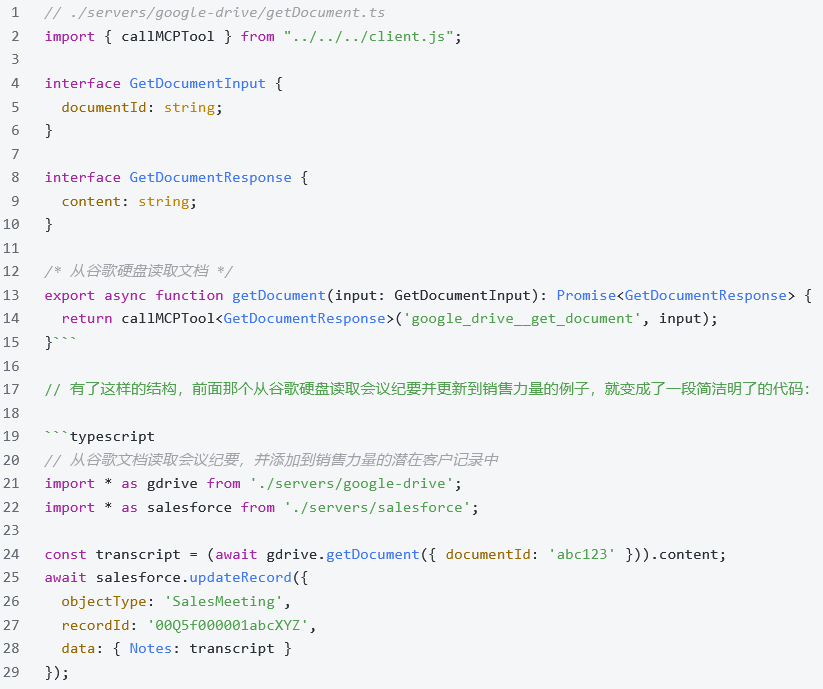 我们可以将MCP服务器提供的工具,不再视为需要直接调用的函数,而是包装成代码层面的API。