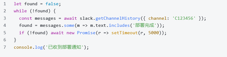 例如,如果需要等待一个在Slack频道中出现的部署完成通知,智能体可以直接编写如下代码: