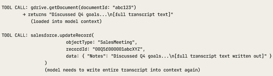 在任务开始前,将所有工具的定义全部加载到模型的上下文窗口中,并在每次工具调用后,将中间结果也塞入其中,这严重拖慢了智能体的响应速度,并急剧增加了运行成本。