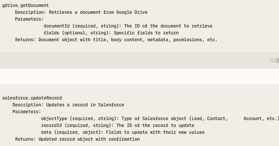 当智能体需要与销售力量交互时,它可以先搜索salesforce,服务器会返回相关的工具列表。