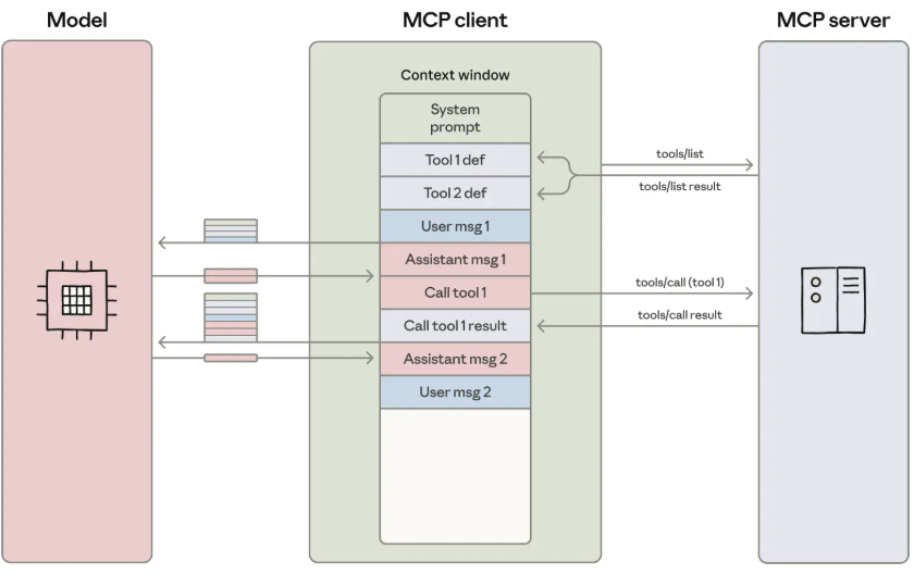 MCP客户端将工具定义加载进模型的上下文窗口,并主导一个消息循环,每一次的工具调用和结果返回,都必须在模型这里过一手。