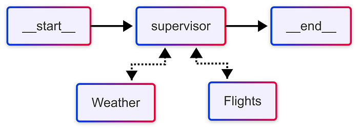 # Set up the Language Modelllm = ChatGoogleGenerativeAI( model="gemini-2.0-flash", api_key=GOOGLE_API_KEY,)# Define the Supervisor's Routing Logic# This Pydantic model helps the supervisor choose the next agent.classRouter(BaseModel): """Decide the next agent to route to.""" next_agent: Literal["Weather", "Flights", "__end__"]# Bind the router to the model to get structured output.supervisor_model = llm.with_structured_output(Router)defsupervisor(state: MessagesState) -> Command: """ The central supervisor that routes to the correct agent or ends the conversation. """ print("--- 🧑💼 SUPERVISOR ---") # The prompt tells the supervisor how to route the user's message. prompt = f"""You are a supervisor routing tasks to a specialist agent. Based on the user's request, choose the appropriate agent. Available agents: - Weather: For questions about weather forecasts. - Flights: For questions about flight information. If the user is saying thank you or the conversation is over, choose '__end__'. User message: "{state['messages'][-1].content}" """ ifisinstance(state['messages'][-1], HumanMessage): # The supervisor model makes the routing decision. response = supervisor_model.invoke(prompt) print(f"Supervisor routing to: {response.next_agent}") return Command(goto=response.next_agent) else: return Command(goto='__end__')# Define the Specialist Agentsdefweather_agent(state: MessagesState) -> Command: """A specialist agent for handling weather-related queries.""" print("--- ☀️ WEATHER AGENT ---") prompt = f"""You are a weather forecaster. Provide a concise mock weather forecast for the location mentioned in the user's message. User message: "{state['messages'][-1].content}" """ response = llm.invoke(prompt) print(f"Response: {response.content}") # Return to the supervisor after the agent has run. return Command( goto="supervisor", update={"messages": [response]}, )defflights_agent(state: MessagesState) -> Command: """A specialist agent for handling flight-related queries.""" print("--- ✈️ FLIGHTS AGENT ---") prompt = f"""You are a flight information assistant. Provide some mock flight details for the destination in the user's message. Respond with short concise information. User message: "{state['messages'][-1].content}" """ response = llm.invoke(prompt) print(f"Response: {response.content}") # Return to the supervisor after the agent has run. return Command( goto="supervisor", update={"messages": [response]}, )# Build the Graphbuilder = StateGraph(MessagesState)# Add the supervisor and agents as nodes in the graph.builder.add_node("supervisor", supervisor)builder.add_node("Weather", weather_agent)builder.add_node("Flights", flights_agent)# The START node directs the flow to the supervisor first.builder.add_edge(START, "supervisor")# The graph is now complete. The `Command` objects will handle the dynamic routing.graph = builder.compile()