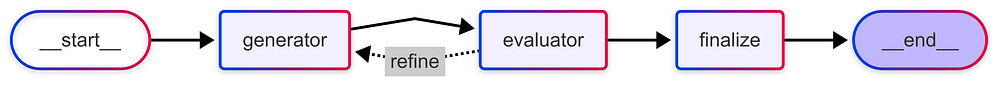 # LLM clientllm = ChatGoogleGenerativeAI( model="gemini-2.0-flash", api_key=GOOGLE_API_KEY,)# StateclassState(TypedDict): task: str draft: str feedback: str final: str# Nodesdefgenerator(state: State): """Generate an initial or refined draft.""" prompt = f"""You are an assistant helping to complete the following task:Task:{state['task']}Current Draft:{state.get('draft', 'None')}Feedback:{state.get('feedback', 'None')}Instructions:- If there is no draft and no feedback, generate a clear and complete response to the task.- If there is a draft but no feedback, improve the draft as needed for clarity and quality.- If there is both a draft and feedback, revise the draft by incorporating the feedback directly.- Always produce a single, improved draft as your output.""" resp = llm.invoke(prompt) return {"draft": resp.content.strip()}defevaluator(state: State): """Evaluate the draft and give feedback or approval.""" prompt = f"""Evaluate the following draft, based on the given task. If it meets the requirements, reply exactly 'APPROVED'. Otherwise, provide constructive feedback for improvement.Task:{state['task']}Draft:{state['draft']}""" resp = llm.invoke(prompt) print(f"""================= DRAFT ================={state['draft']}================ FEEDBACK ==============={resp.content.strip()}========================================""") return {"feedback": resp.content.strip()}defdecide(state: State) -> str: """Decide next step: either approve and finish, or refine again.""" if"APPROVED"in state["feedback"].upper(): return"approved" return"refine"deffinalize(state: State): """Save the final approved draft.""" return {"final": state["draft"]}# Build the graphbuilder = StateGraph(State)builder.add_node("generator", generator)builder.add_node("evaluator", evaluator)builder.add_node("finalize", finalize)builder.add_edge(START, "generator")builder.add_edge("generator", "evaluator")builder.add_edge("evaluator", "finalize")# Conditional edges from decidebuilder.add_conditional_edges( "evaluator", decide, { "approved": "finalize", # stop loop "refine": "generator", # go back for improvement },)builder.add_edge("finalize", END)graph = builder.compile()