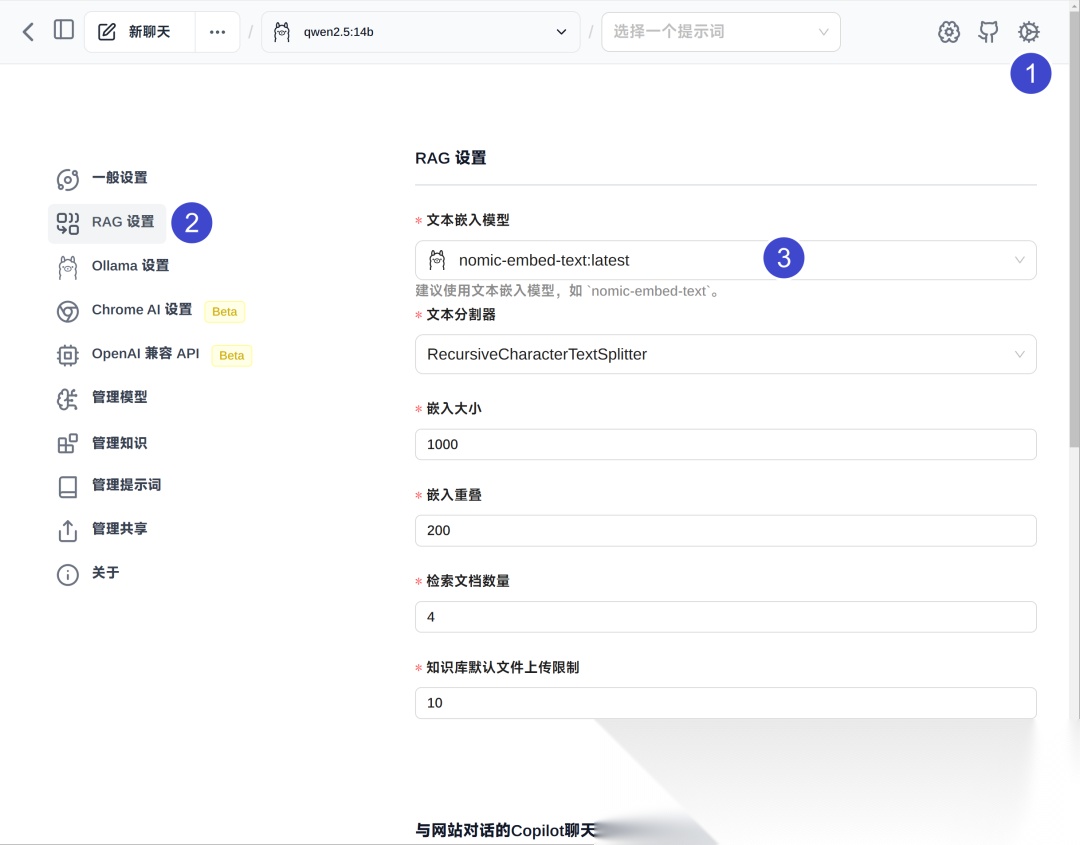然后点击 RAG 设置,选择刚才下载好的模型,点击保存。
