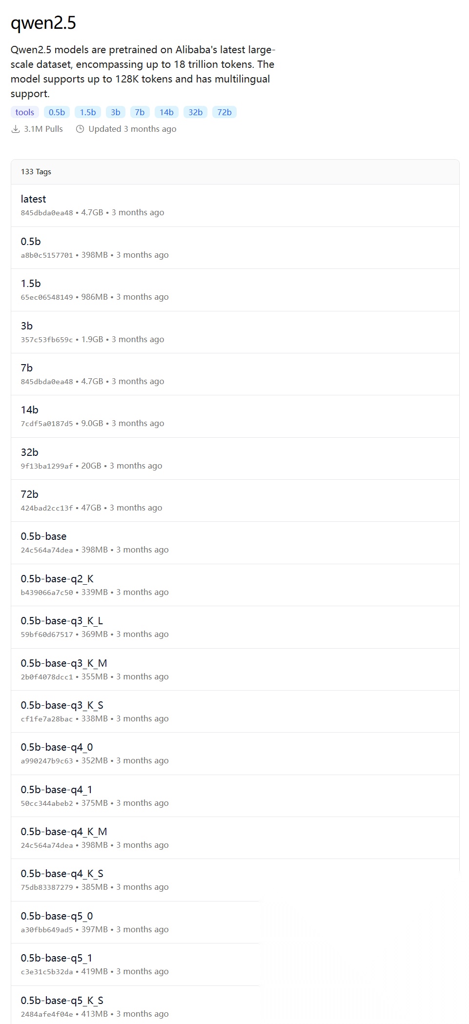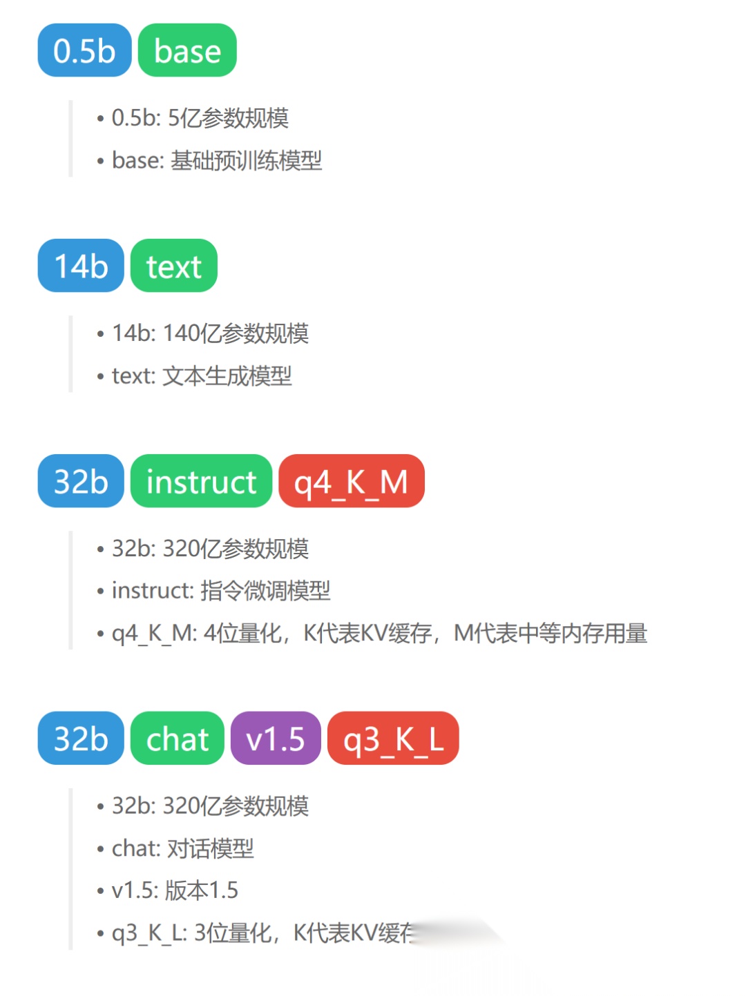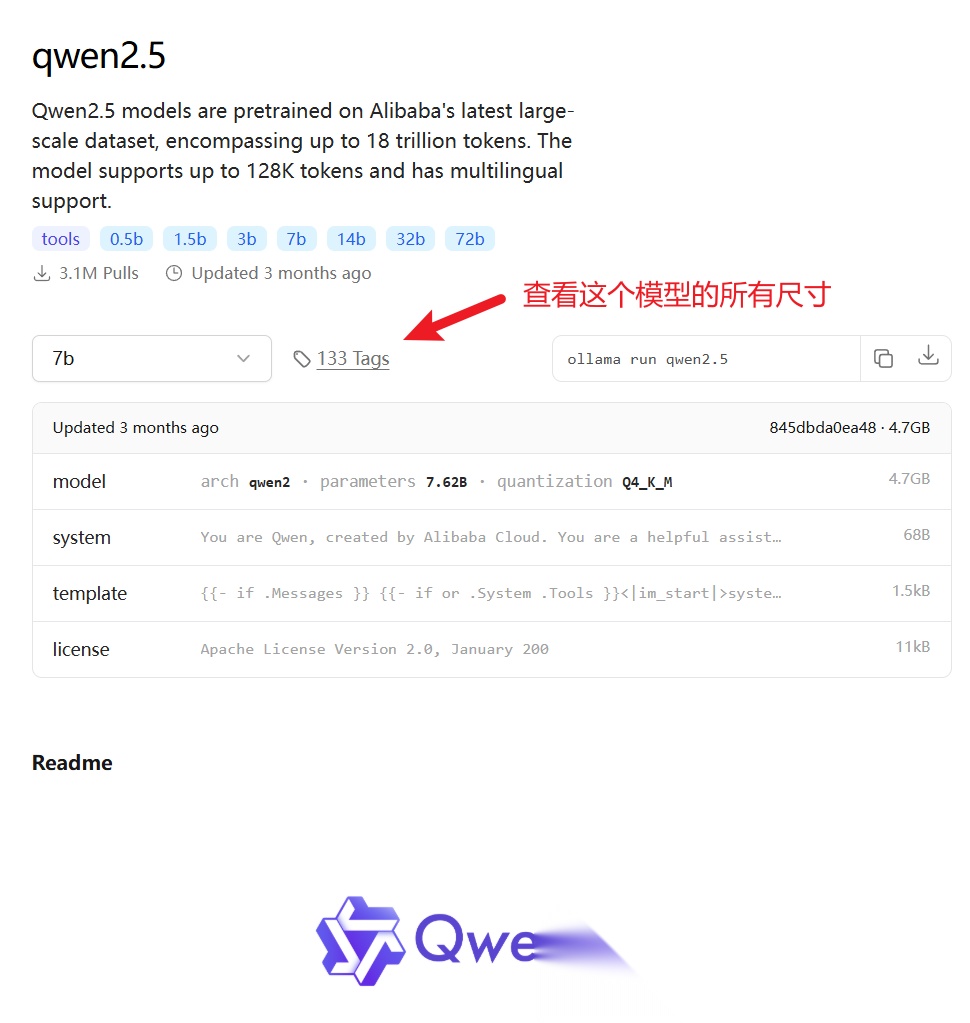 下面蓝色的标签含义是:模型支持的尺寸,比如 千问(qwen2.5)模型就有 0.5b - 72b 等多种尺寸可选。