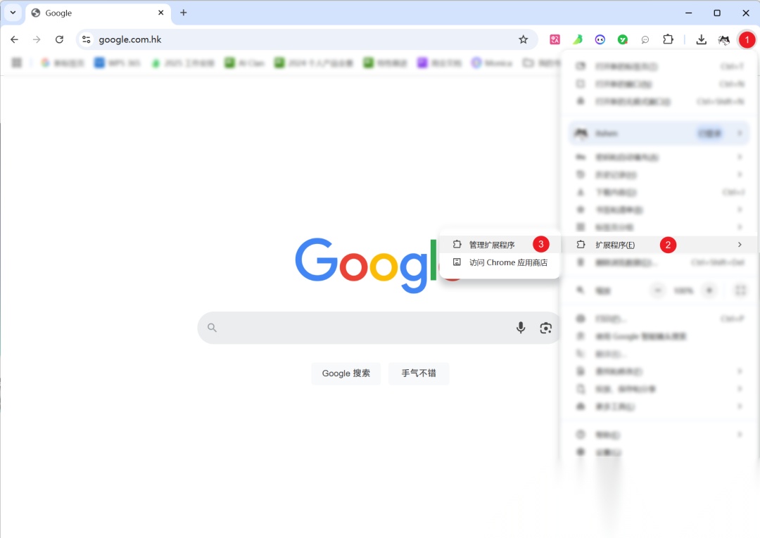 下载完成后,进入谷歌浏览器,然后点击右上角,找到管理扩展程序。