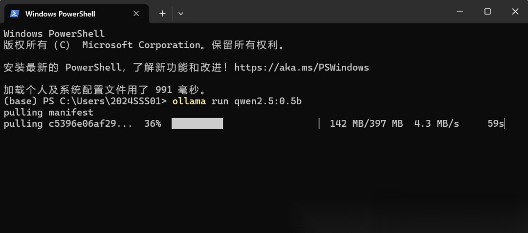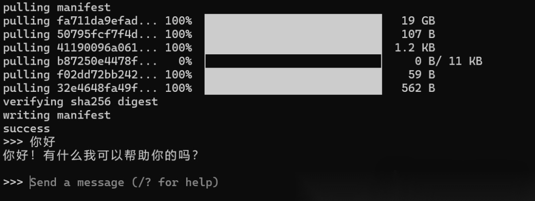 输入指令之后,如果你已经下载好了模型,就会直接进进入对话,如果没有,就会进入下载流程。