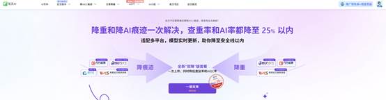 - 技术亮点:基于自研模型,通过重构句式、增加口语化表达降低AI特征,宣称可同步降低查重率。