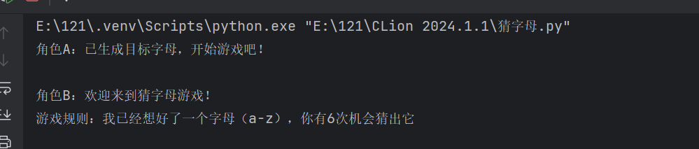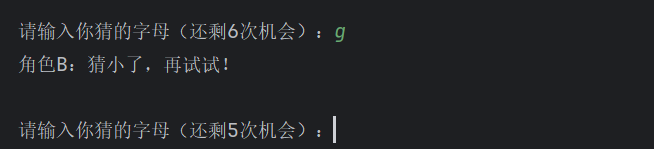 我们使用的代码生成工具是ChatGPT(GPT-4),它支持自然语言需求输入,能快速生成代码并实时优化功能,适配小组协作的高效需求。guess = input(f"\n请输入你猜的字母(还剩{remaining}次机会):")print("游戏规则:我已经想好了一个字母(a-z),你有6次机会猜出它")print(f"角色B:{result},请重新输入")print(f"角色B:{result}