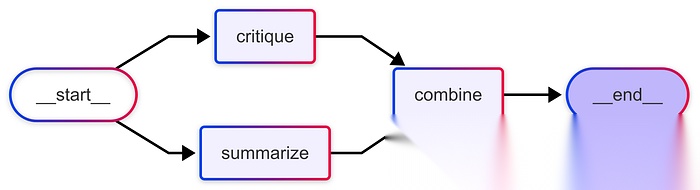 # LLM clientllm = ChatGoogleGenerativeAI( model="gemini-2.0-flash", api_key=GOOGLE_API_KEY,)# State definitionclassState(TypedDict): text: str # Reducer makes these append-only so multiple nodes can update in parallel outputs: Annotated[list, operator.add]# Nodesdefsummarize(state: State): prompt = f"Summarize in one sentence:\n\n{state['text']}" resp = llm.invoke(prompt) return {"outputs": [f"Summary: {resp.content.strip()}"]}defcritique(state: State): prompt = f"Critique briefly:\n\n{state['text']}" resp = llm.invoke(prompt) return {"outputs": [f"Critique: {resp.content.strip()}"]}defcombine(state: State): prompt = f"Combine the following Critique and Summarization in one \ paragraph:\n\n{state['text']}" resp = llm.invoke(prompt) return {"outputs": [f"Combined:\n{resp.content.strip()}"]}# Build the graphbuilder = StateGraph(State)builder.add_node("summarize", summarize)builder.add_node("critique", critique)builder.add_node("combine", combine)# Parallel edges: summarize and critique run side by sidebuilder.add_edge(START, "summarize")builder.add_edge(START, "critique")# Both join into combinebuilder.add_edge("summarize", "combine")builder.add_edge("critique", "combine")builder.add_edge("combine", END)graph = builder.compile()