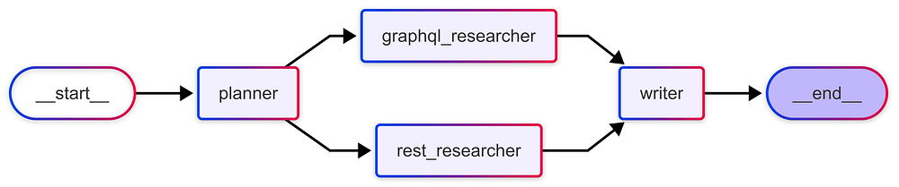 PLANNER: Creating a plan for parallel executionNode 'planner' output:---{'plan': ['Research GraphQL pros', 'Research REST cons', 'Write comparison post']}==============================GRAPHQL RESEARCHER: Searching for'pros of GraphQL'Node 'graphql_researcher' output:---{'graphql_results': 'GraphQL Pros: Efficient data fetching (no over-fetching), single endpoint, strongly typed schema.'}==============================REST RESEARCHER: Searching for'cons of REST APIs'Node 'rest_researcher' output:---{'rest_results': 'REST API Cons: Can lead to over or under-fetching data, requires multiple round-trips for complex queries, URL-based structure can be rigid.'}==============================WRITER: Synthesizing resultsNode 'writer' output:---{'final_output': '## GraphQL vs. REST: A Quick Comparison\n\nChoosing the right API architecture is crucial for efficient data handling. Both GraphQL and REST offer solutions, but cater to different needs and priorities.\n\n**GraphQL shines with its:**\n\n* **Efficient Data Fetching:** GraphQL allows clients to request only the data they need, avoiding the common REST problem of over-fetching.\n* **Single Endpoint:** A single endpoint simplifies API interaction and management.\n* **Strongly Typed Schema:** The schema ensures data consistency and facilitates client-side development.\n\n**REST APIs, while well-established, can be less efficient due to:**\n\n* **Over/Under-Fetching:** REST endpoints often return more or less data than required, leading to wasted bandwidth and unnecessary processing.\n* **Multiple Round-Trips:** Complex data requirements may necessitate multiple API calls, increasing latency.\n* **Rigid URL Structure:** The URL-based structure can be inflexible and challenging to adapt to evolving data needs.\n\n**In Conclusion:**\n\nGraphQL excels in scenarios demanding precise data retrieval and complex queries, while REST remains a viable option for simpler applications where performance is less critical. The best choice depends on the specific requirements and constraints of your project.'}==============================PLANNER: Creating a plan for parallel executionGRAPHQL RESEARCHER: Searching for'pros of GraphQL'REST RESEARCHER: Searching for'cons of REST APIs'WRITER: Synthesizing resultsFinal Comparison Post:## GraphQL vs. REST APIs: A Quick ComparisonChoosing the right API architecture is crucial forany web application. Two popular options are GraphQL and REST APIs, each with its own strengths and weaknesses. Here's a brief comparison:**GraphQL:*** **Pros:** GraphQL excels at efficient data fetching. By allowing clients to request only the specific data they need, it eliminates the problem of over-fetching common in REST APIs. It also offers a single endpoint and a strongly typed schema, contributing to better developer experience and improved data validation.**REST APIs:*** **Cons:** REST APIs can suffer from over or under-fetching, leading to inefficient data transfer. Complex queries often require multiple round-trips to different endpoints, increasing latency. Furthermore, its URL-based structure can sometimes feel rigid and inflexible.**In conclusion:**GraphQL shines when data efficiency and precise control over data fetching are paramount. REST APIs, while potentially less efficient in certain scenarios, are a well-established standard with a vast ecosystem of tools and resources. The best choice depends on the specific needs and complexity of your project.