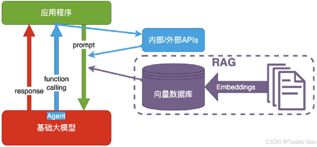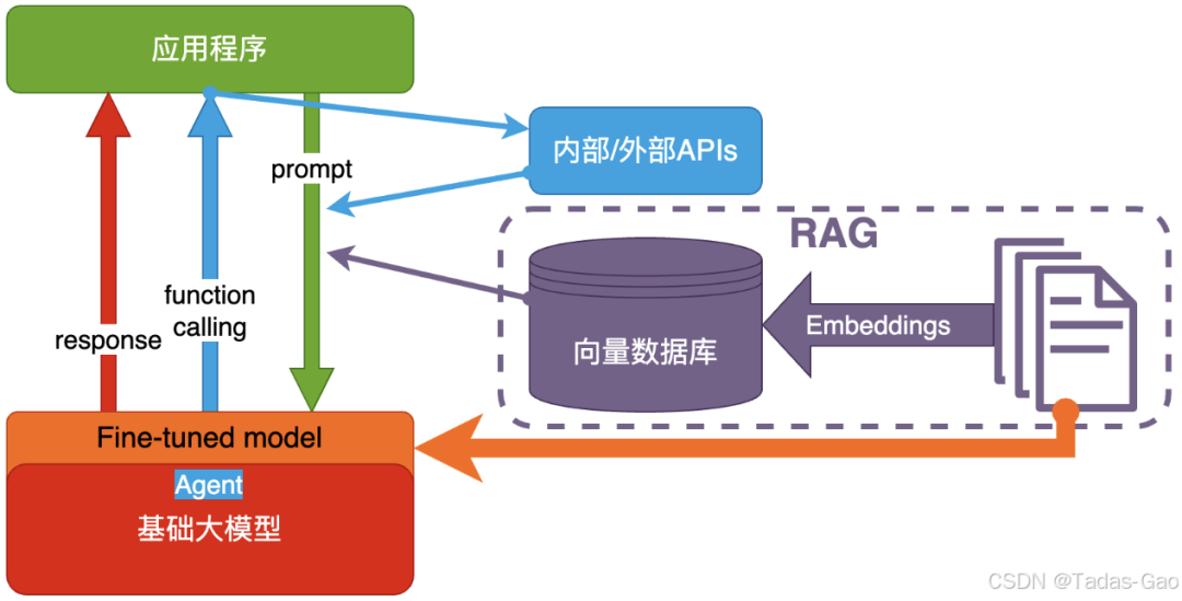 大模型应用的技术架构主要有四种方式:纯 prompt、Agent+Function Calling、RAG(检索增强生成)和 Fine-tuning(微调)。