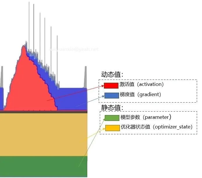 - 激活值Activations):前向传播中产生的中间结果,是显存的“动态成本”。与输入序列长度、批次大小(BatchSize)直接相关,反向传播时需完整保留,因此训练场景的激活值占用远高于推理。
