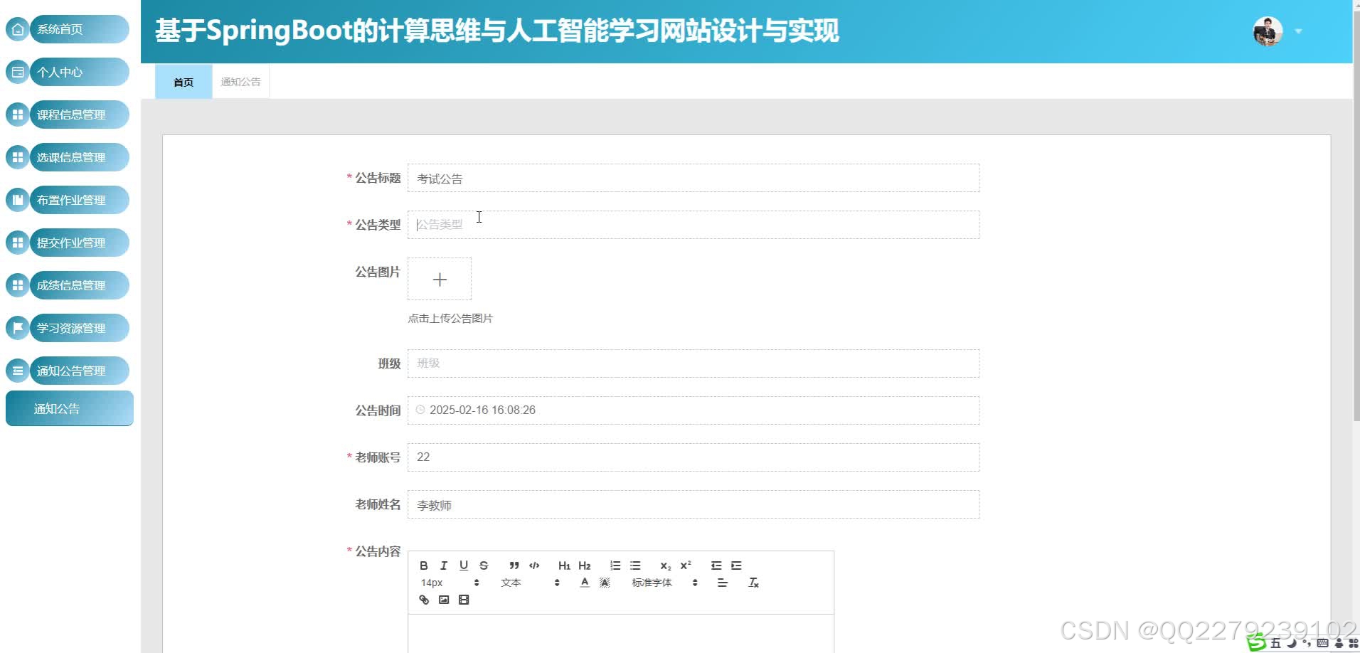系统采用 Java Spring Boot 开发后端服务,整合 MySQL 数据库(存储课程、资源、作业等 12 类数据)与 Redis 缓存(热门课程、学习进度),前端通过 Vue 实现响应式界面。核心模块包括:计算思维导向课程体系(分基础 / 进阶 / 实战层级)、智能选课(基于能力测评匹配课程)、多形态资源库(视频 / 案例 / 代码模板)、在线作业提交与 AI 辅助批改、成绩自动统计与学习短板分析,集成学习进度实时同步功能。