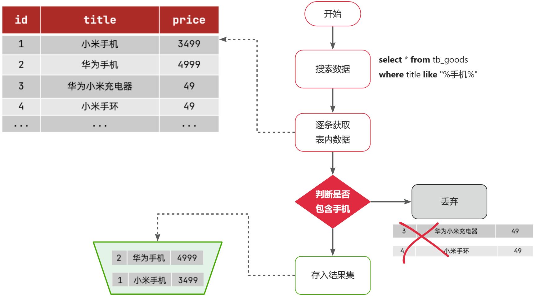 like '%手机%',需要找到title中包含手机的数据 - 2)逐条遍历每行数据(每个叶子节点),比如第1次拿到