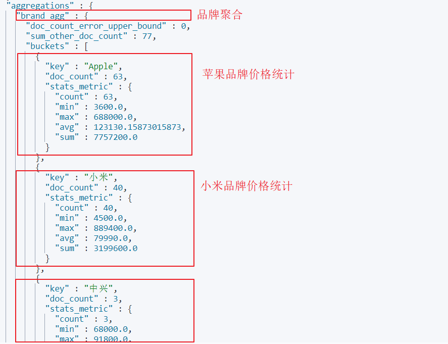 由于stats是对brand_agg形成的每个品牌桶内文档分别做统计,因此每个品牌都会统计出自己的价格最小、最大、平均值。