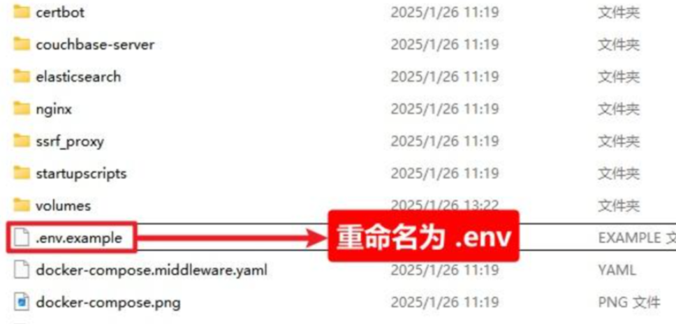 进入到docker文件夹内部,找到.env.example隐藏文件,改名为.env