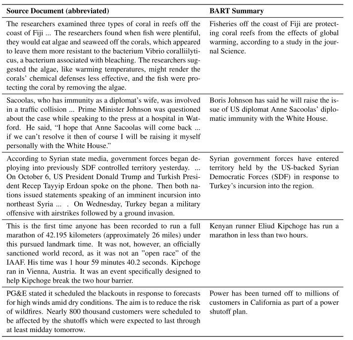 表7显示了BART生成的示例摘要。示例取自创建预训练语料库后发布的WikiNews文章,以消除模型训练数据中出现所描述事件的可能性。根据Narayan et al.(2018),我们在总结文章之前删除了文章的第一句话,因此没有简单的摘录摘要。