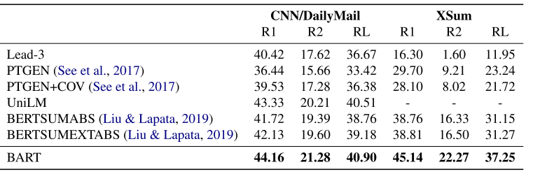 Summarization 为了与最先进的摘要进行比较,我们给出了CNN/DailyMail和XSum这两个具有不同属性的摘要数据集的结果。CNN/DailyMail的摘要往往与源句相似。提取模型在这里做得很好,甚至前三个源句子的基线也是高度竞争的。然而,BART比所有现有的工作都要好。