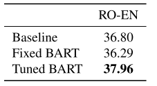 表6:基线和BART在WMT ' 16 RO-EN上的性能(BLEU)与反向翻译数据的增强。BART通过使用单语英语预训练来改进强回译(BT)基线。