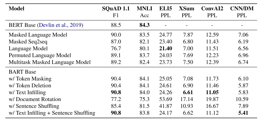 表1:预训练目标对比。所有模型的大小都相当,并且在书籍和维基百科数据的组合上进行了1M步的训练。底部两个块中的条目使用相同的代码库在相同的数据上进行训练,并使用相同的过程进行微调。第二个区块的条目受到先前工作中提出的预训练目标的启发,但已简化为专注于评估目标(参见§4.1)。不同任务的性能差异很大,但是具有文本填充的BART模型表现出最一致的强大性能。