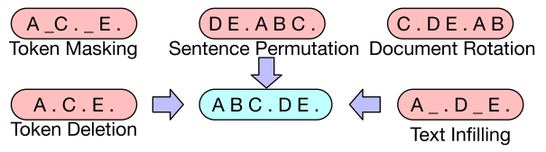 BART的训练方法是先破坏文档,然后优化重建损失——解码器输出和原始文档之间的交叉熵。现有的去噪自动编码器是针对特定的去噪方案量身定制的,BART允许我们应用任何类型的文档损坏。在极端情况下,关于源的所有信息都丢失了,BART相当于语言模型。