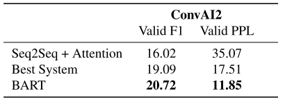 表4:BART在会话响应生成方面优于以前的工作。基于ConvAI2的官方标记器对困惑进行了重新规范化。