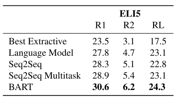 表5:BART在具有挑战性的ELI5抽象问答数据集上获得了最先进的结果。比较模型来自Fan等人(2019)。