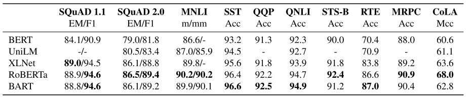 表2:在SQuAD和GLUE任务上的大型模型的结果。BART的性能与RoBERTa和XLNet相当,这表明BART的单向解码器层不会降低判别任务的性能。