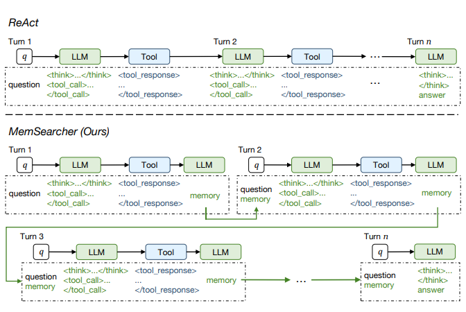 MemSearcher提出了一个比较有意思的解决方案:在多轮交互过程中迭代维护一个紧凑的记忆,并在每轮将它与当前问题结合。具体工作流程是,每一轮MemSearcher首先将用户问题与记忆融合,生成推理轨迹并执行搜索动作,然后根据新的观察结果更新记忆,只保留对解决任务至关重要的信息。这种设计让上下文长度在多轮交互中保持稳定,在不牺牲准确性的前提下提升了效率。