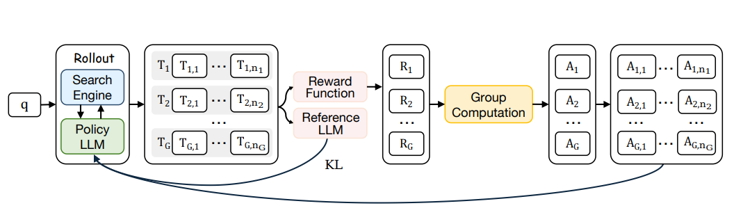 为了优化这个工作流,研究者引入了multi-context GRPO,这是一个端到端的强化学习框架,能够联合优化MemSearcher的推理能力、搜索策略和记忆管理。Multi-context GRPO会在不同上下文下采样多组轨迹,并在所有对话中传播轨迹级别的优势信号。